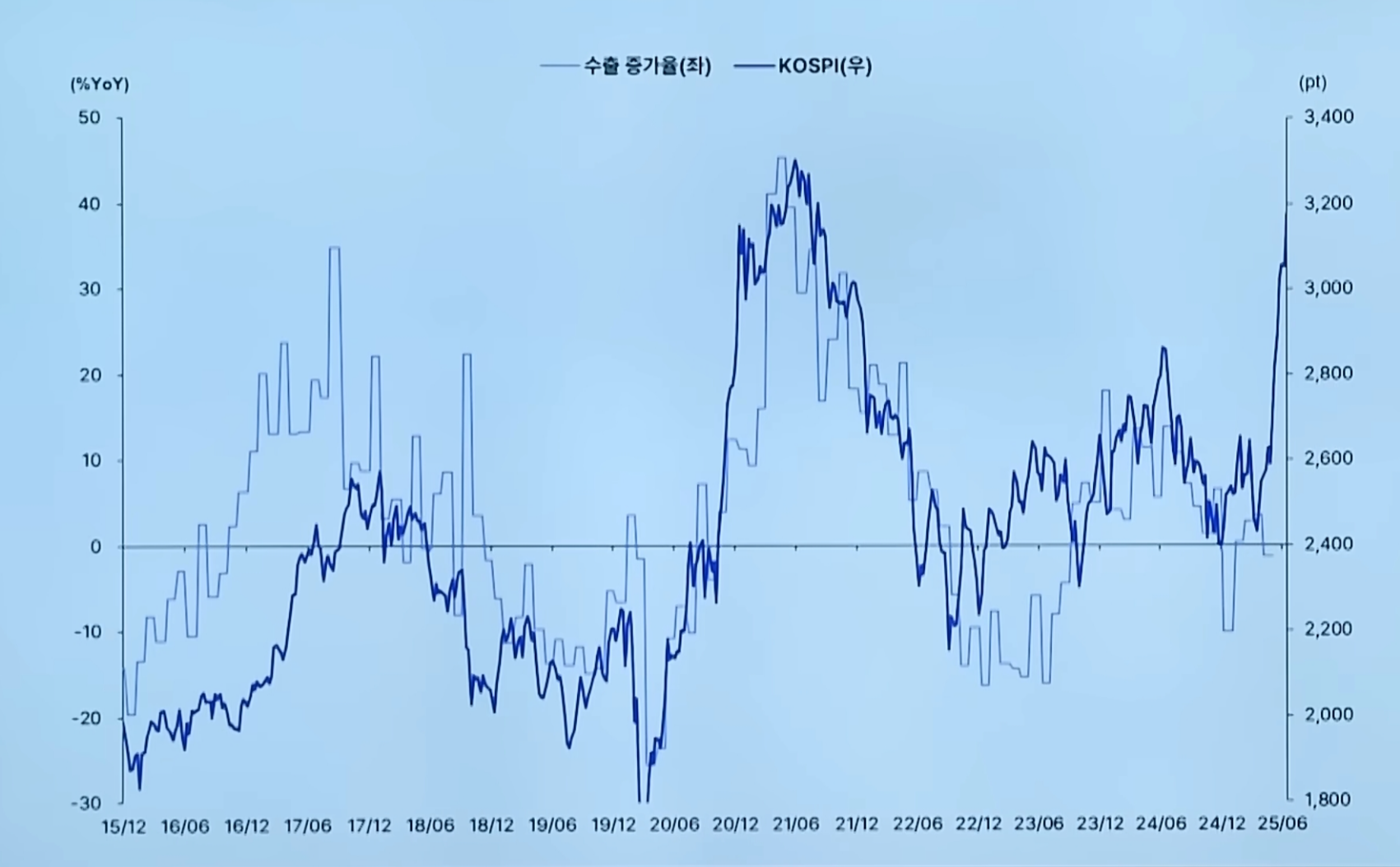 예를 들어 보여주신 그래프 중 하나는 ‘우리나라 수출 증가율 vs 코스피 지수’의 관계였다.