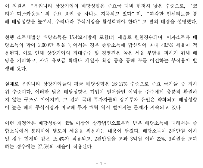 이번 배당소득 분리과세 개편안은 2025년 4월, 소득세법 개정안 형태로 국회에 발의되었다.