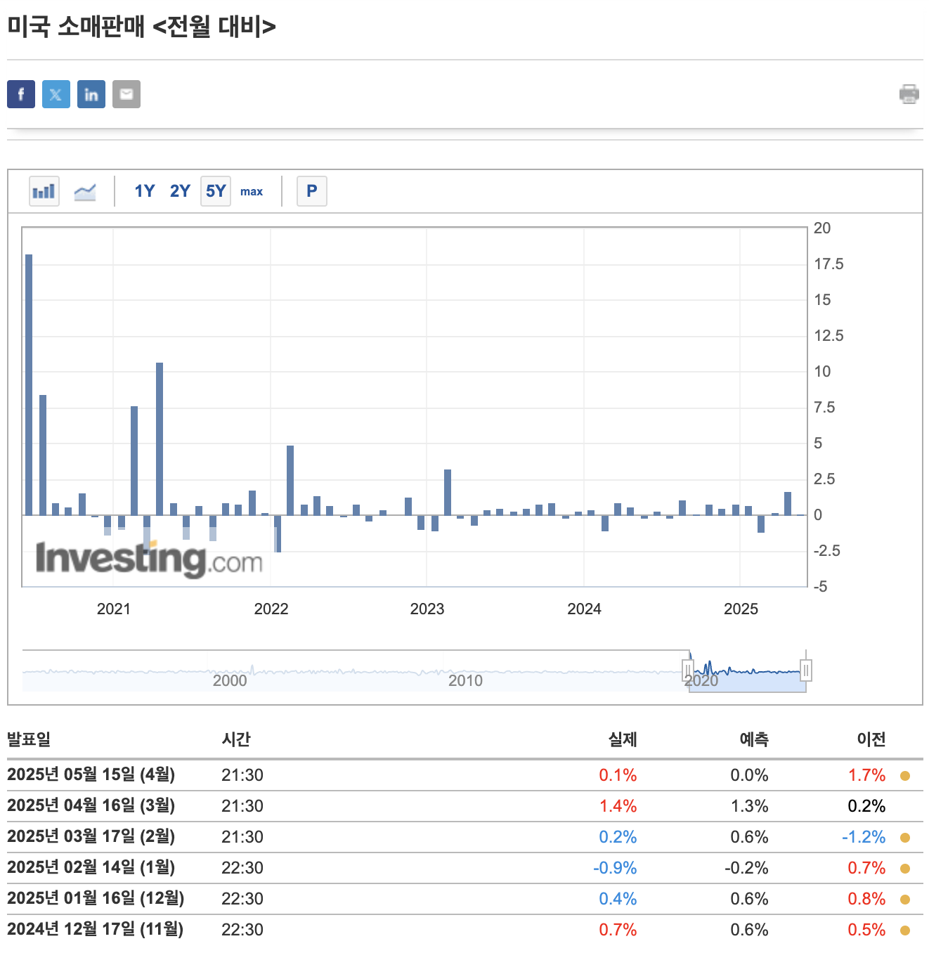 같은 날 발표된 미국 4월 소매판매 지표 역시 시장의 우려를 자극했다. 미 상무부에 따르면, 4월 소매판매는 7241억 달러로 전월 대비 0.1% 증가에 그쳤다. 이는 시장의 예상치였던 0.0%보다는 높았지만, 3월 증가율 1.7%와 비교하면 급격히 둔화된 수치이다.