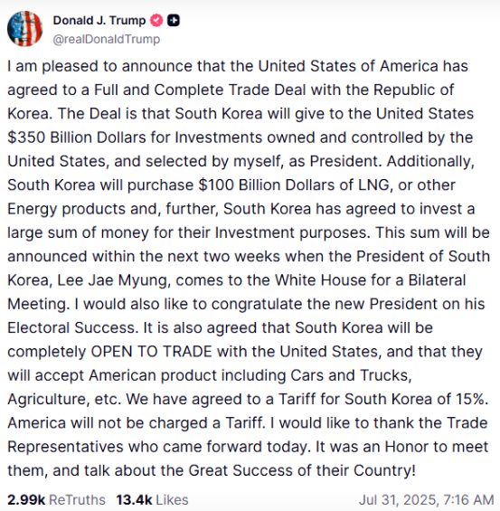 2025년 7월 30일, 도널드 트럼프 미국 대통령은 “한국과 전면적이고 완전한 무역 협정에 합의했다”라고 발표했다.