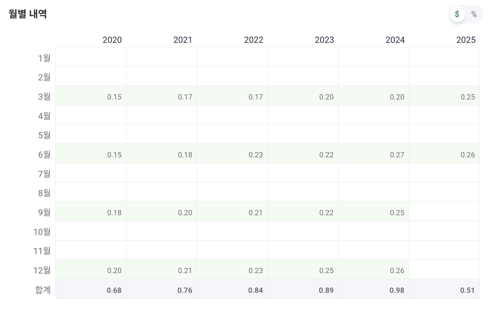 - 배당 지급 주기: 분기 배당 (3,6,9,12월)