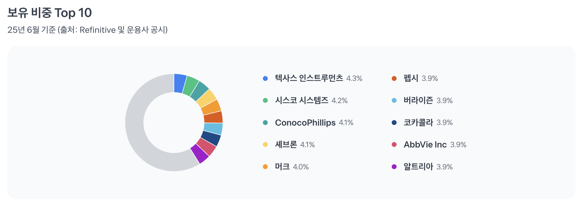 적당한 배당 수익률, 검증된 우량주 중심의 구성, 그리고 꾸준한 배당 성장성까지.