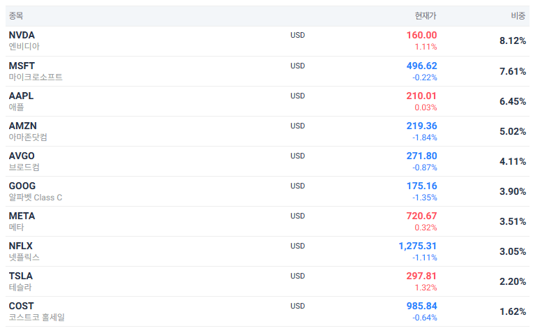 위 사진을 보면, 우리가 흔히 말하는 ‘매그니피센트 7’를 포함한 기술주 중심 구성이다.