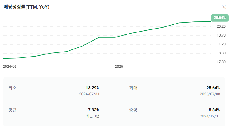 배당성장률도 준수한 편인데, 최근 3년 평균 약 7%의 배당 성장률을 기록했다.