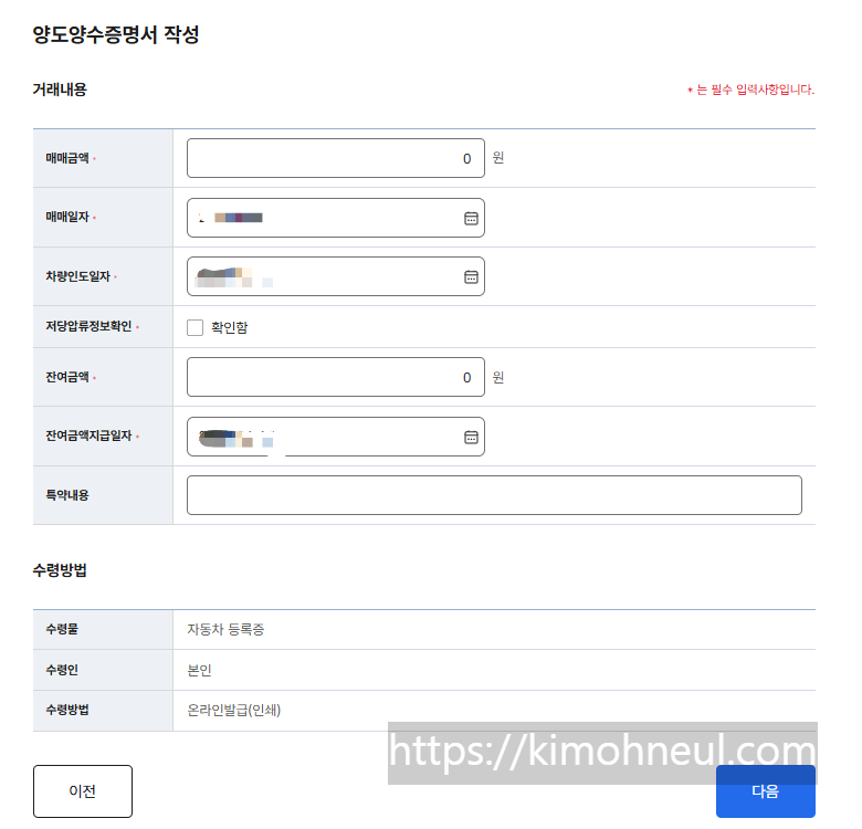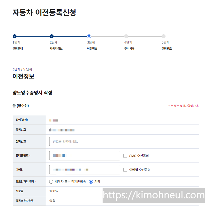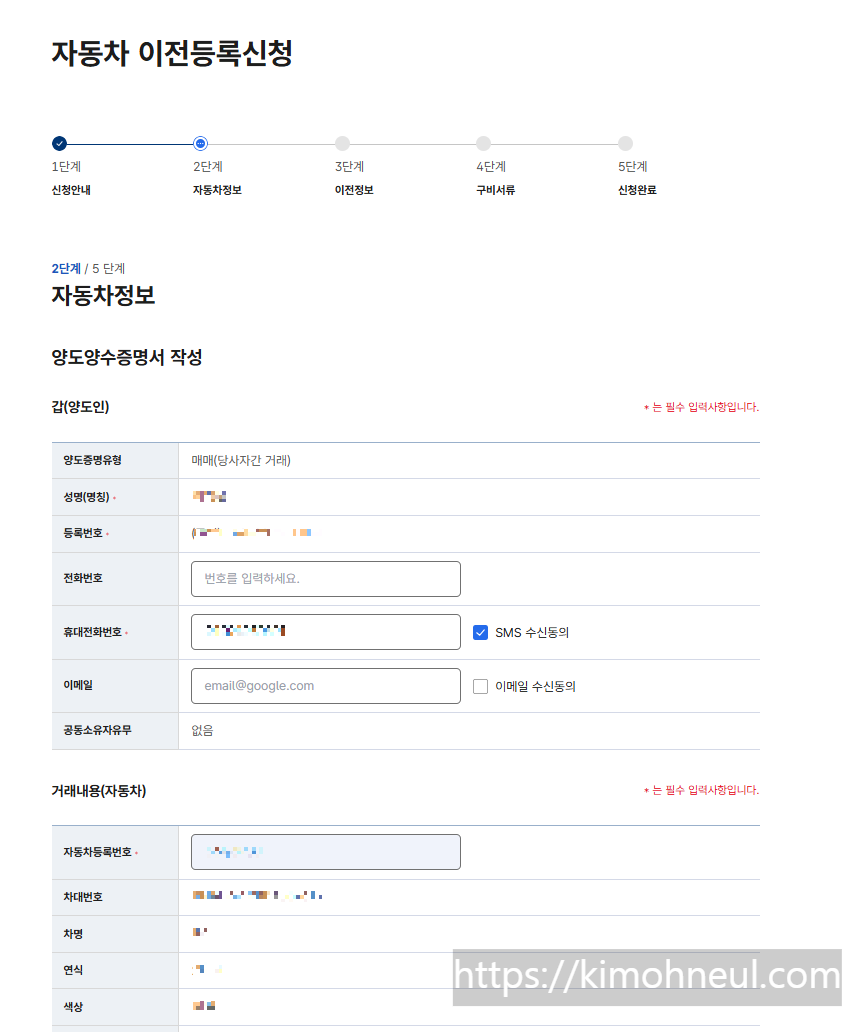 2. 자동차 양도계약서에 기반한 이전 정보 입력
