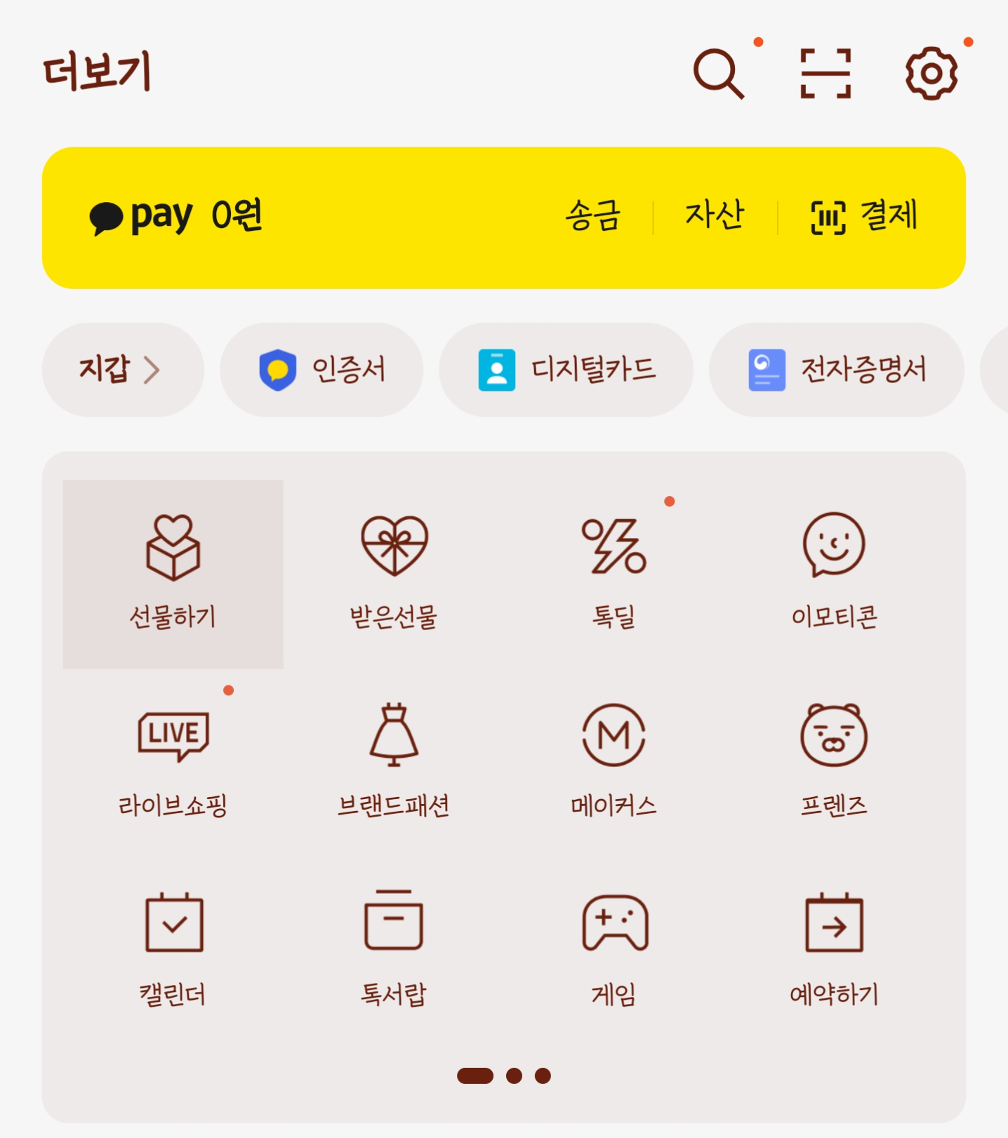 - 카카오톡 하단 ‘더 보기’ → ‘선물하기’ 선택