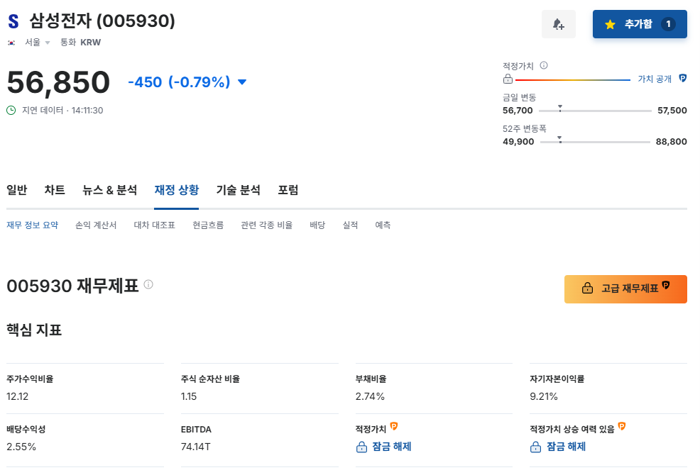 보고 싶은 기업을 찾아서 재정상황을 보면 아래와 같이 핵심 지표로 간단하게 PER, PBR, ROE 등을 볼 수 있다.