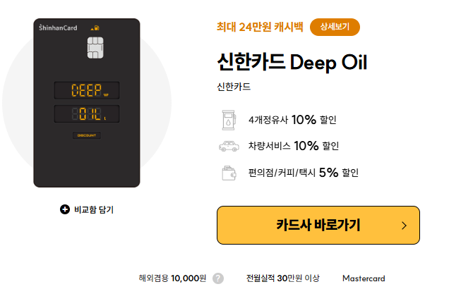 사용 중인 카드는 신한 Deep Oil 카드로, 월 30만 원 실적 조건에 따라 주유소·주차장 10% 할인 혜택을 받고 있다.