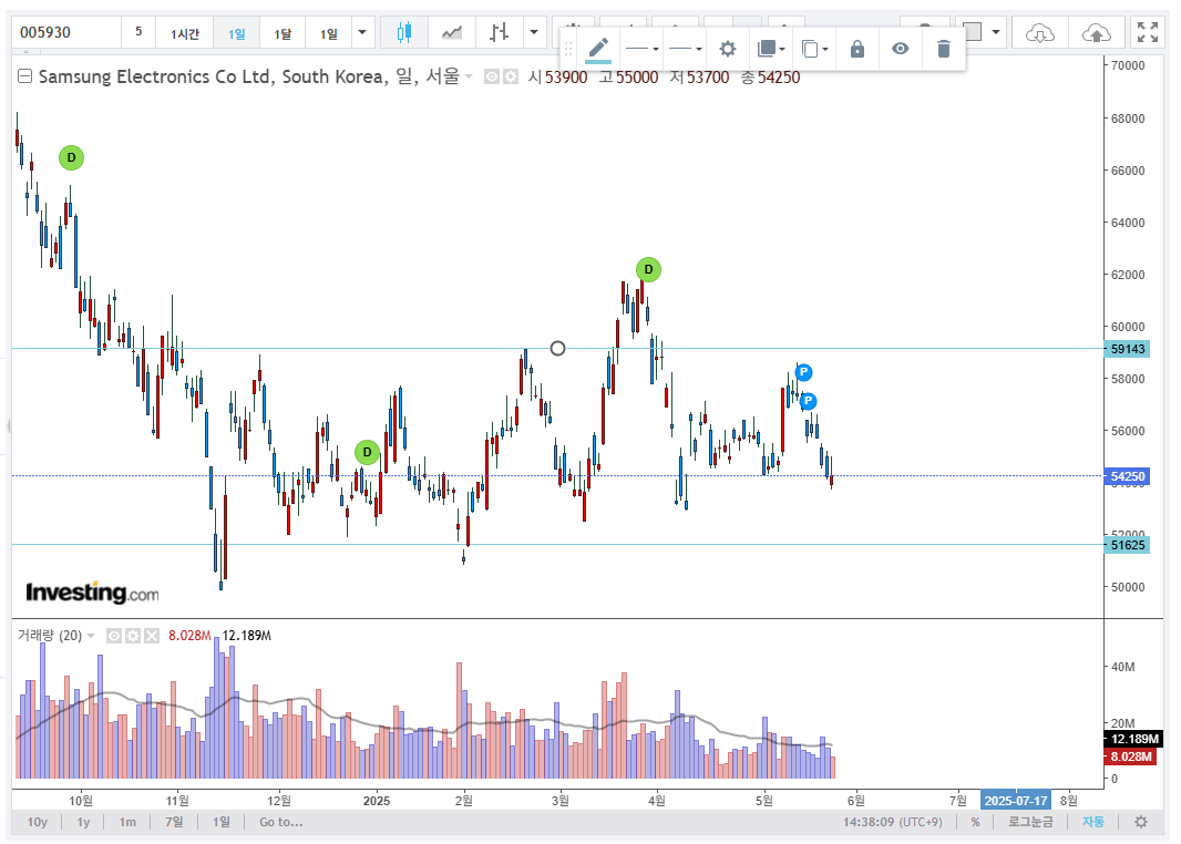 삼성전자는 최근 51,000원~59,000원 사이 박스권에서 횡보 중이다.